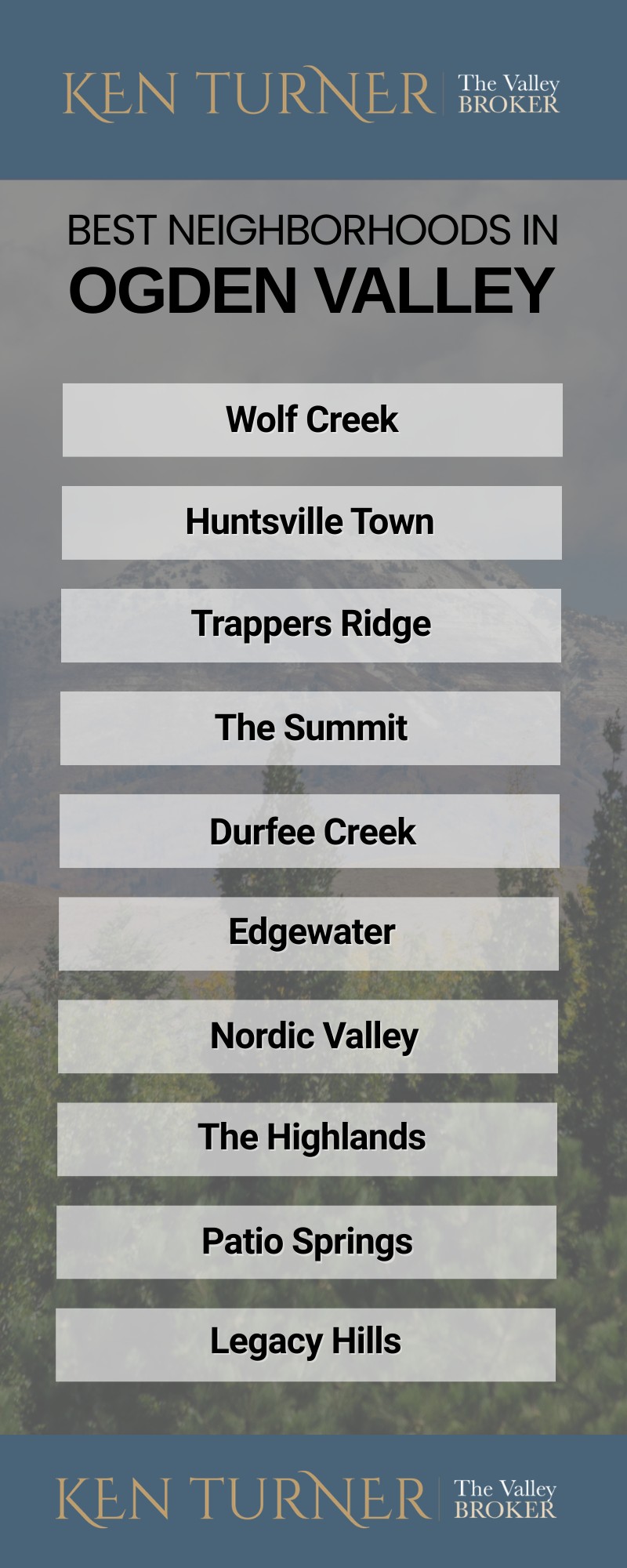 The best places to live in Ogden Valley include Wolf Creek Resort for golf and amenities, Huntsville Town for historic charm and walkability, and Trappers Ridge for vacation rental potential.